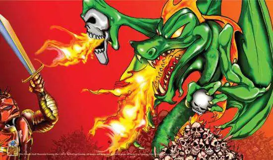 A Nested Egg original design, the dragon Skull mountain game mat is designed of top quality material; it is constructed with highly vivid print cloth surface, and dense black open cell sponge rubber base with a non skid bottom that grips the surface with a soft, smooth surface to help with the longevity of gaming sleeves and cards.