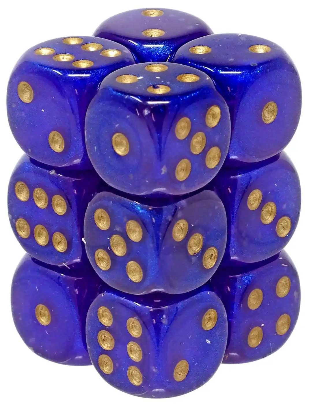 Pack of 12 count 16mm 6-sided d6 dice. Royal Purple with Gold [CHX27787]Luminary Effect Glows in the Dark.