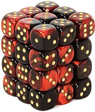 Pack of 36 count 12mm 6-sided d6 dice. Gemini Black-Red With Gold [CHX26833]