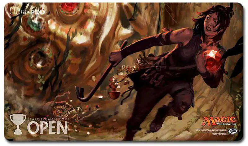 Playmat with premium fabric top to prevent damage to cards during game play. Dimensions are approximately 24″ X 13-1/2″. Rubber backing lets the play mat lay flat and prevents the mat from shifting during use.